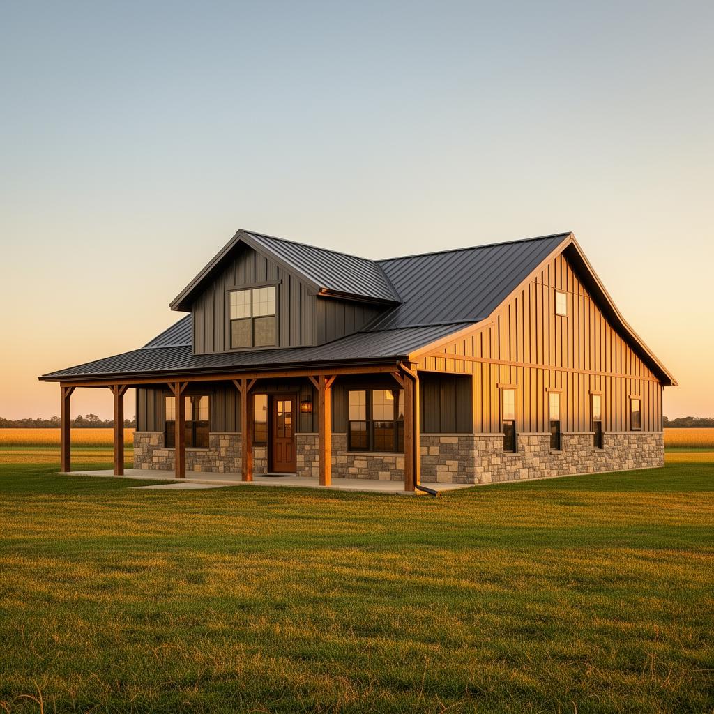 Quality barndominium construction - custom ranch and two-story barndominiums with modern finishes, porches, and attached or detached garages.